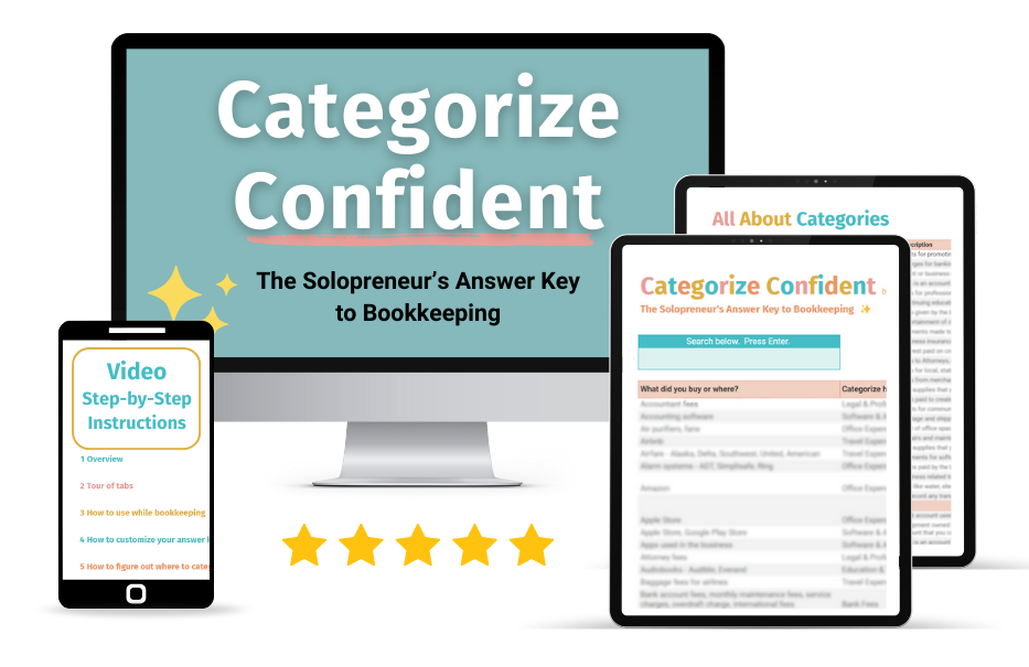 Once you click the button and purchase, you'll immediately be granted access to everything inside of Categorize Confident: The Solopreneurâs Answer Key to Bookkeeping.